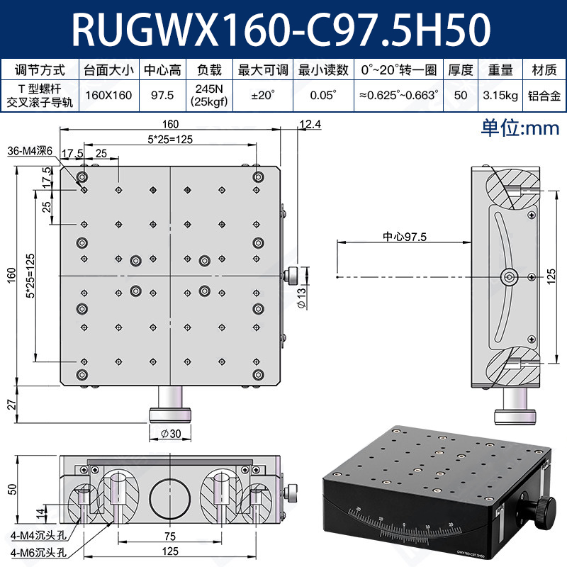 160台面精密手动角位台:RUWX/Y160